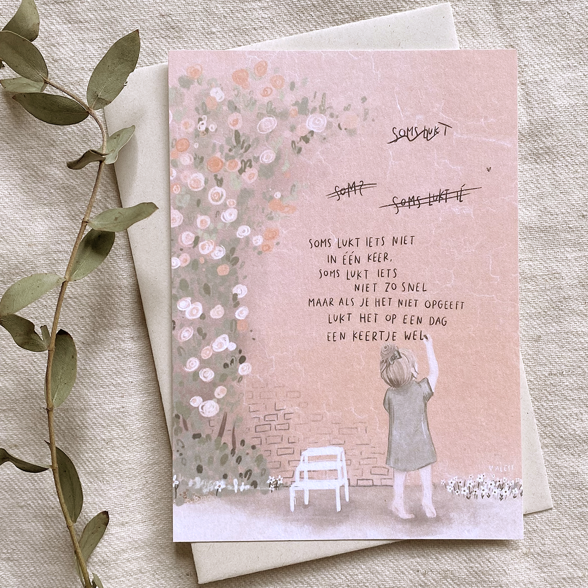 Een A6 Ansichtkaart met gedichtje over falen maar toch doorgaan.