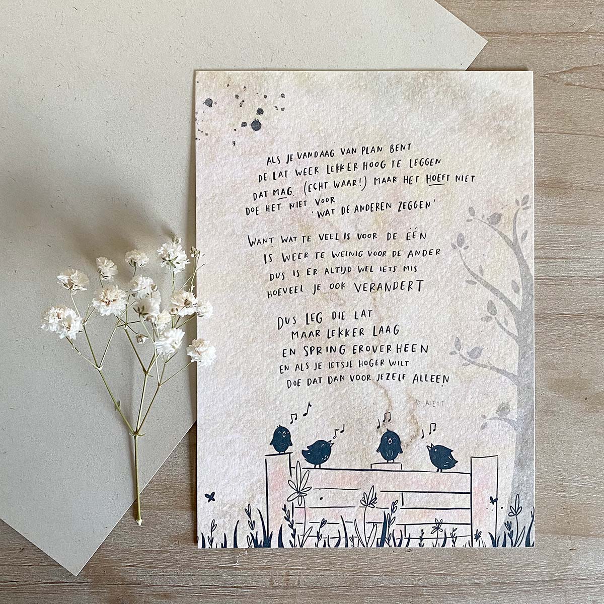 Ansichtkaart A6 (inclusief envelop) met gedichtje ‘de lage lat’. Een bemoediging om het jezelf soms even wat minder moeilijk te maken! Gedrukt op ongestreken 300 grs. papier met een mooie matte uitstraling.