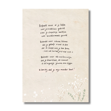 Ansichtkaart A6 met gedichtje over moeders. Leuk om te geven voor moederdag! Gedrukt op stevig wit papier met een lichte structuur.