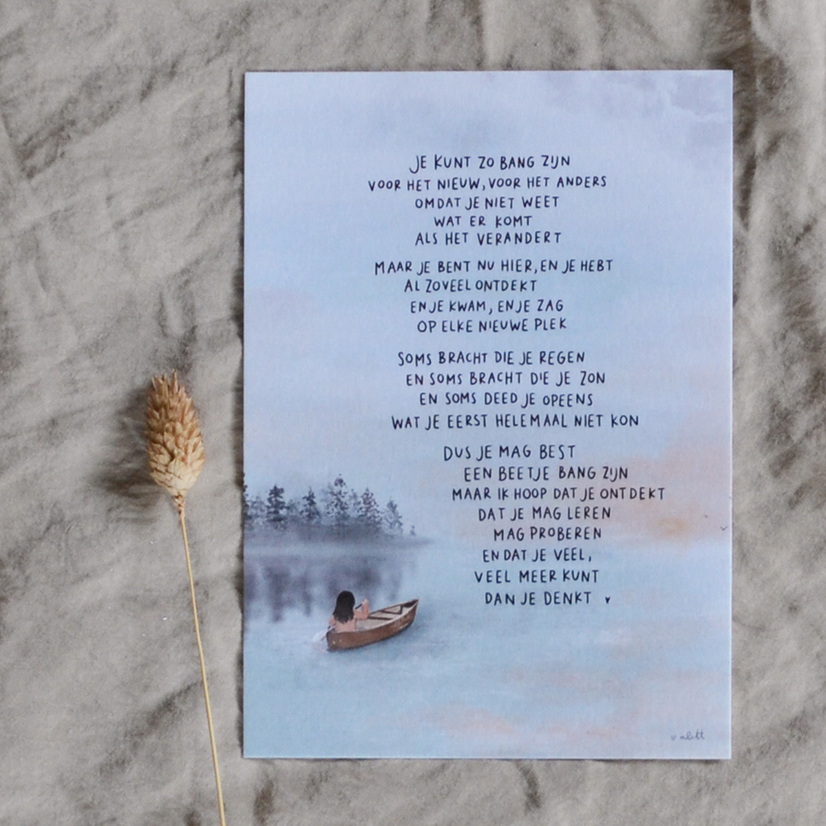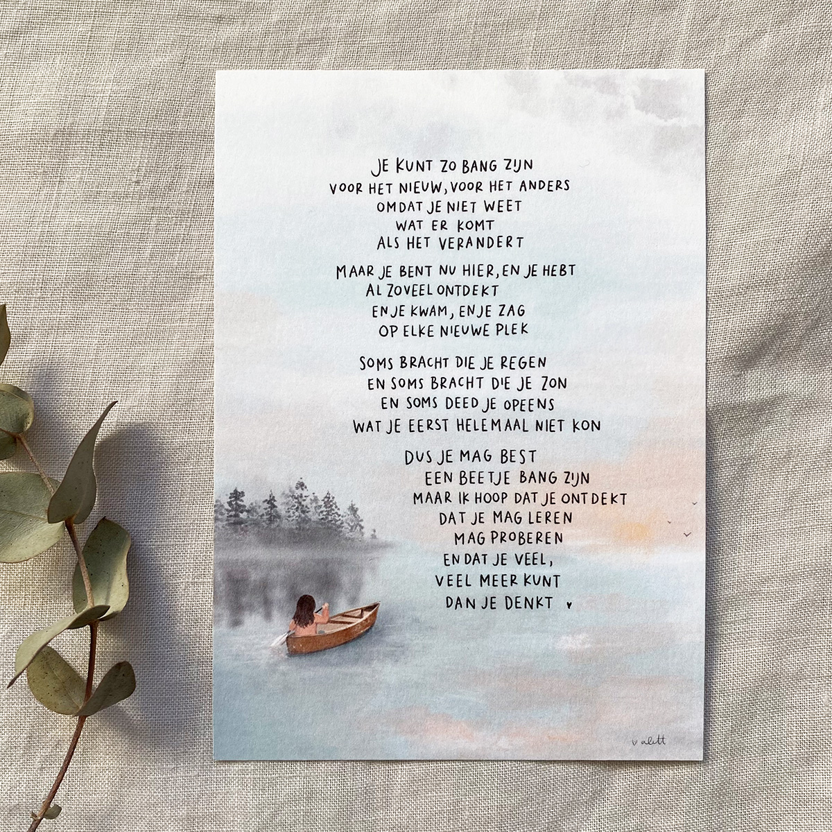 Ansichtkaart met illustratie en gedichtje over leren en ontdekken. Verkrijgbaar op verschillende formaten.