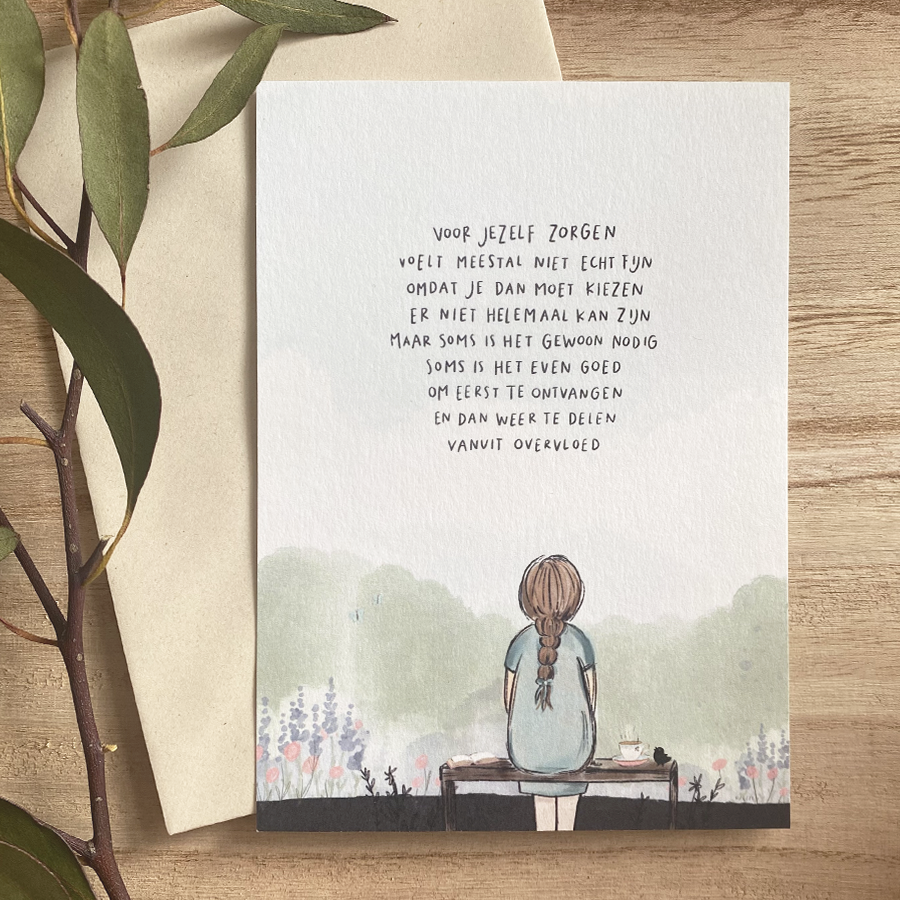 Een A6 Ansichtkaart met gedicht over voor jezelf zorgen en hoe belangrijk dat is.