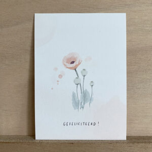 Een A6 Ansichtkaart met bloem en tekst “gefeliciteerd”