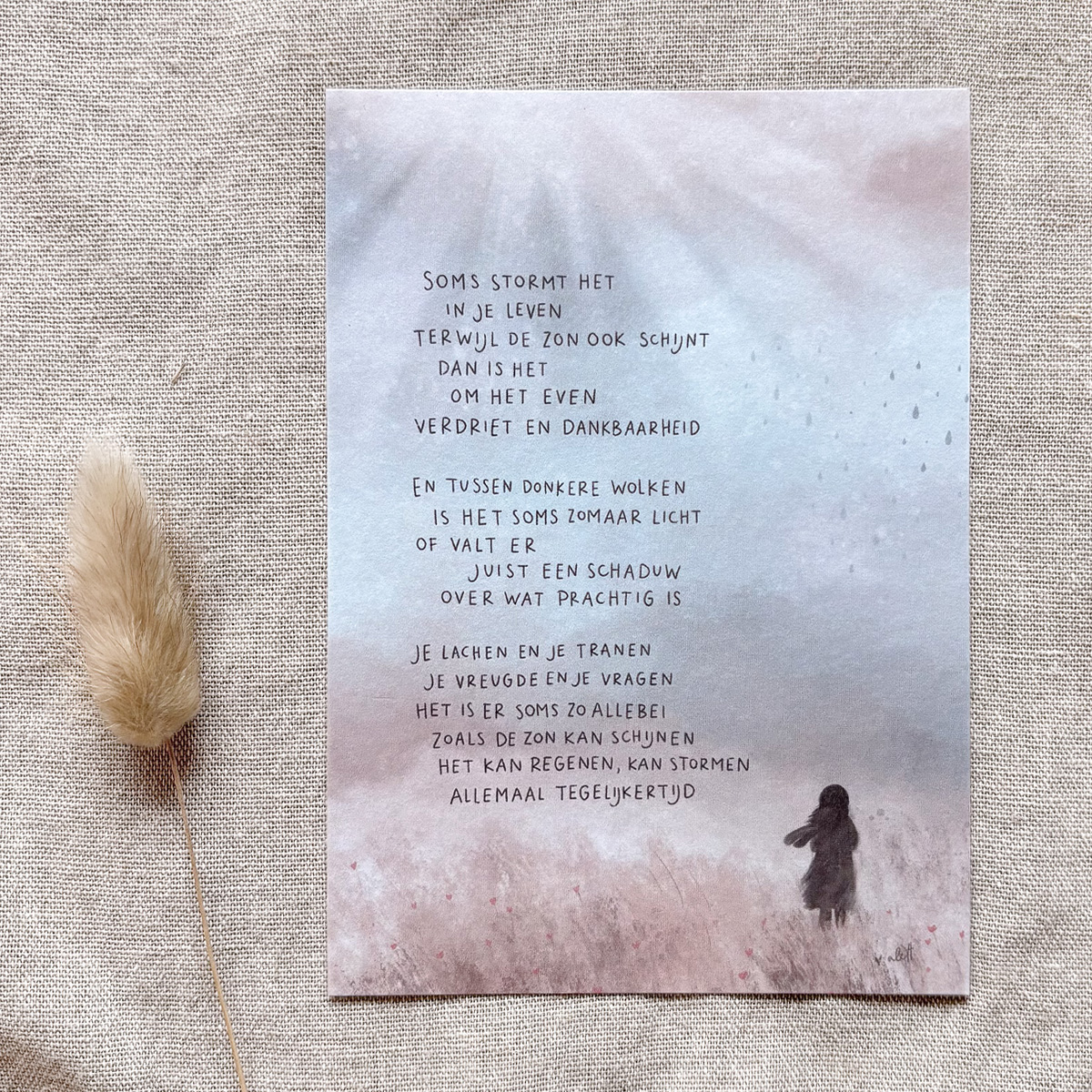 Ansichtkaart A6 (inclusief envelop) met gedichtje over vreugde en verdriet, wat in het leven soms zo door elkaar loopt.