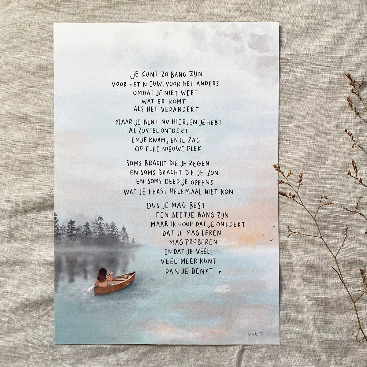 Poster op A4 met illustratie en gedicht over leren en ontdekken.