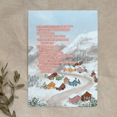 Miniposter op A5 met illustratie van een winterdorp en een gedichtje voor de decembermaand.